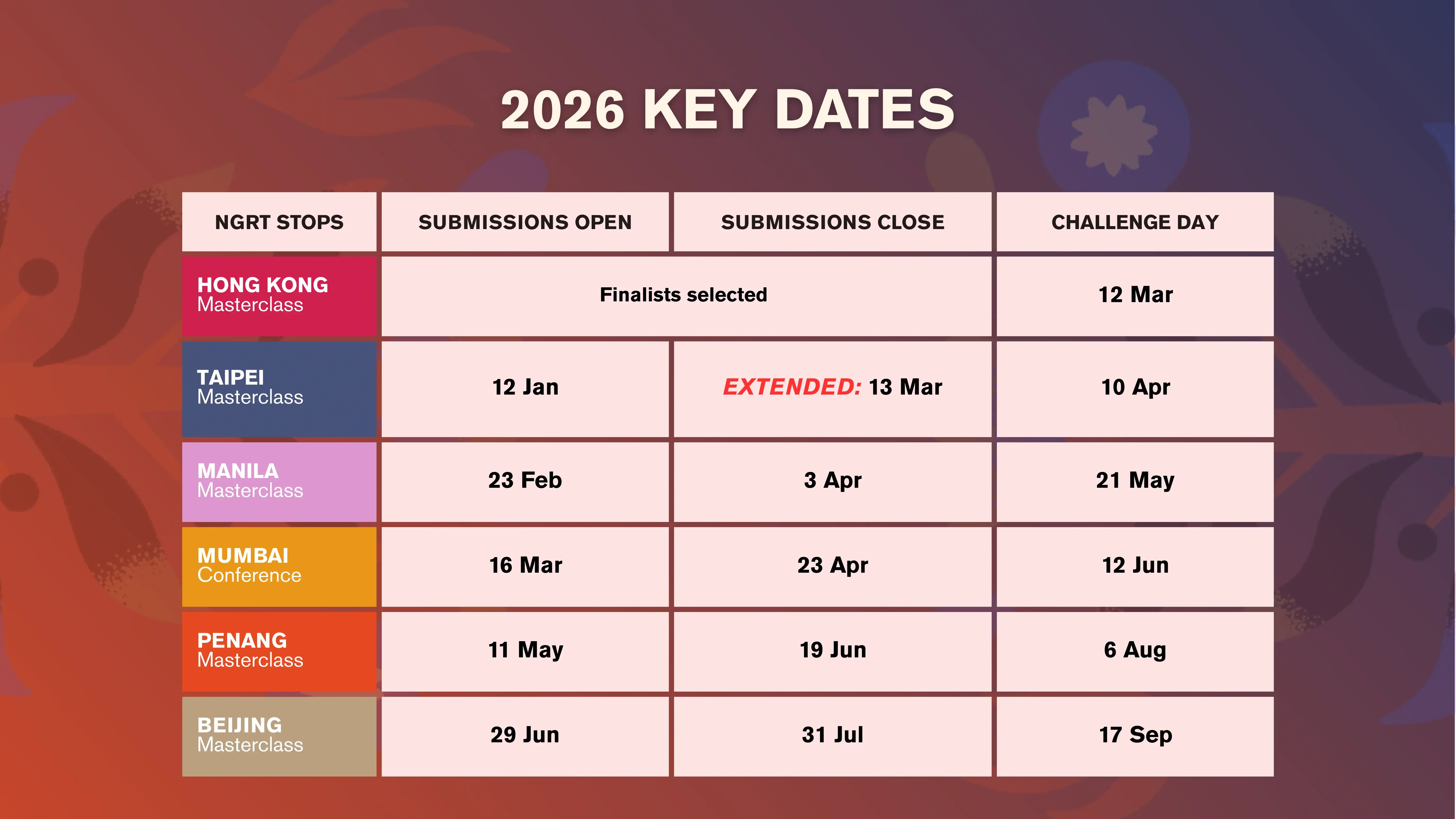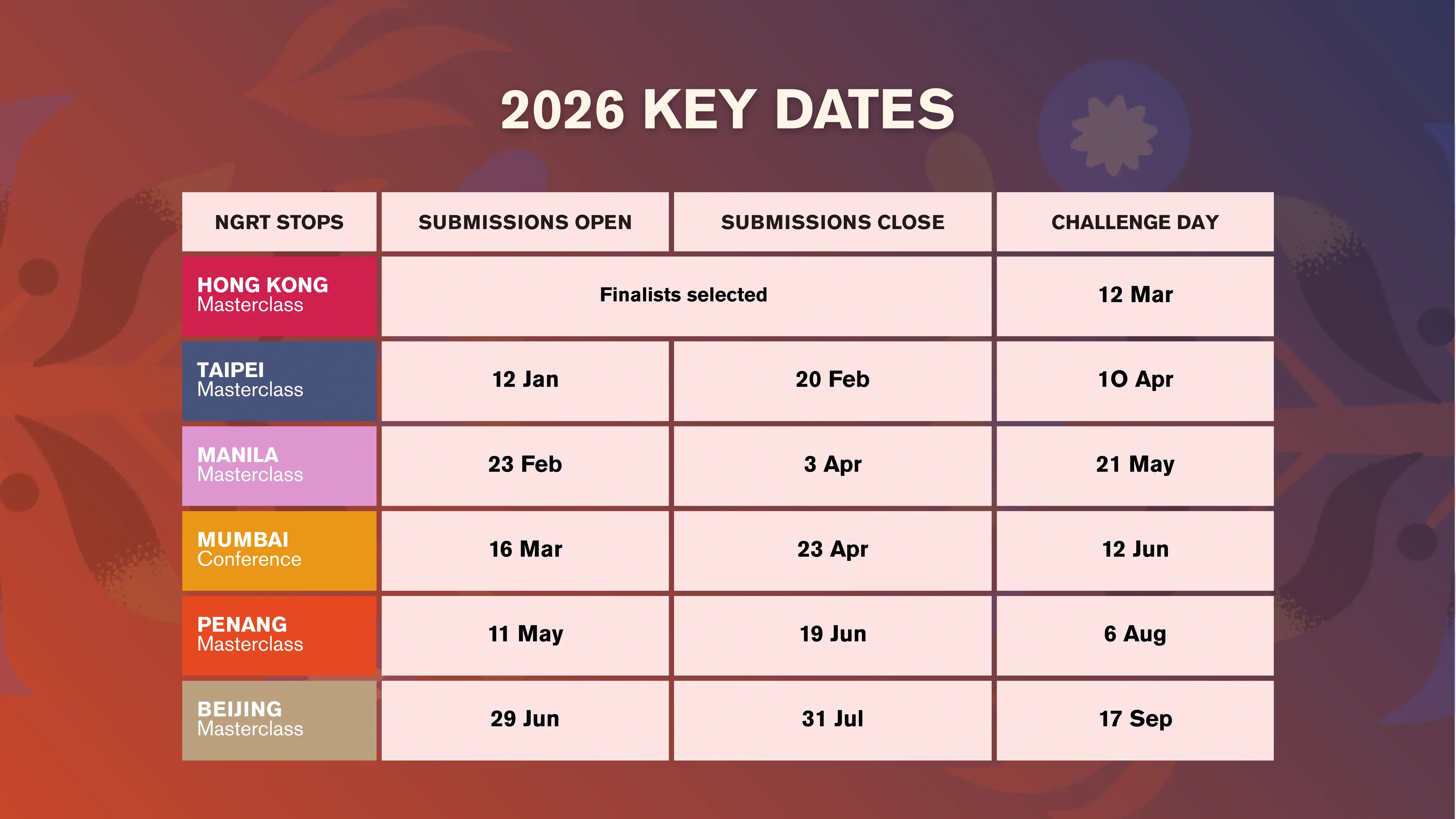 Submissions for Hong Kong have closed, stay tuned for the in-person Challenge on 12 March 2026.